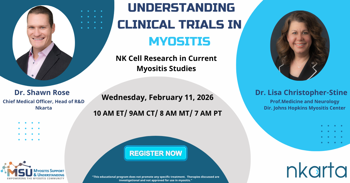 Join us for an educational webinar focused on clinical trials and the potential of NK cell therapy’s role in current myositis research. Learn more about new emerging cell therapies from one of our community’s most trusted specialists – Dr. Lisa Christopher-Stine, MD, MPH, along with Dr. Shawn Rose, MD, PhD, Chief Medical Officer and Head of Research & Development, Nkarta Inc.