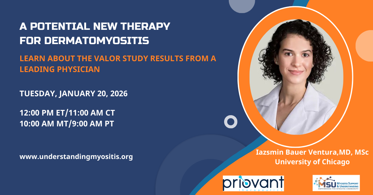 MSU Zoom Video Session Video session using ZoomTuesday, January 20 12 PM ET/11 AM CT/10 AM MT/9 AM PT Join us for an informative webinar on the results of the VALOR study, which tested an investigational, once-daily oral medication for adults with dermatomyositis (DM) in the largest DM clinical trial ever conducted. In this 30-minute session, rheumatologist Dr. Iazsmin Ventura (University of Chicago) will review the study findings and […]